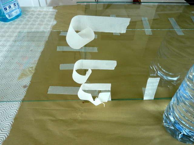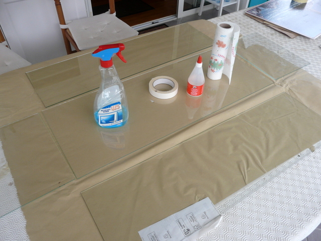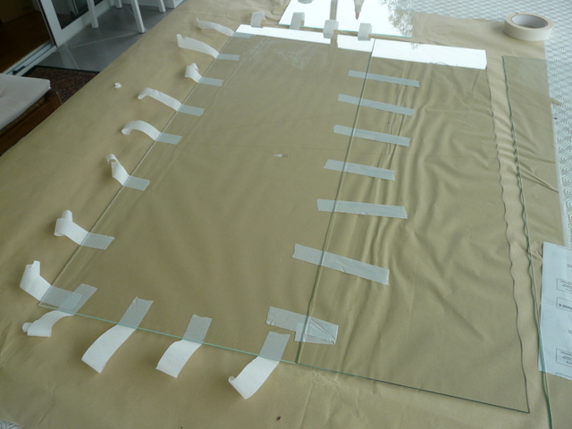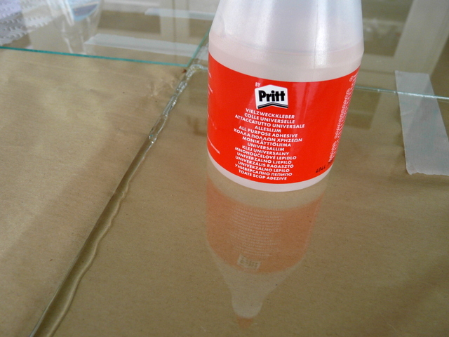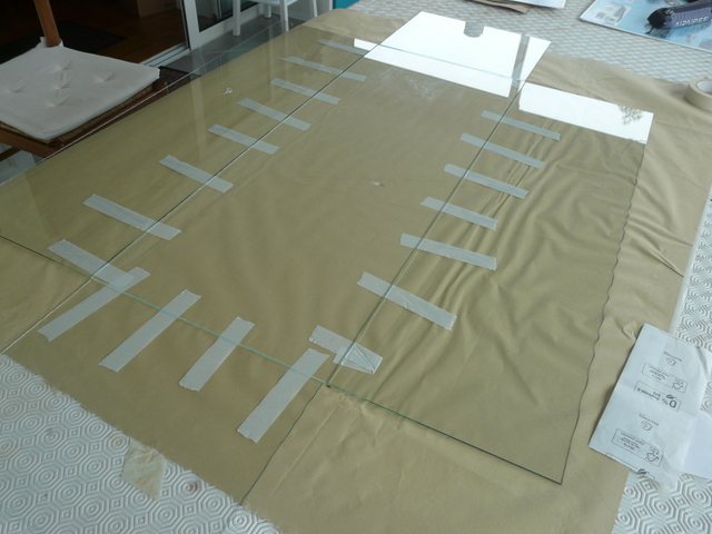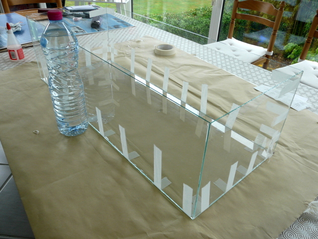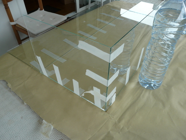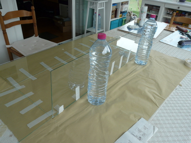 En fin de compte, il suffit simplement d’assembler une boîte……en verre. Pour cela on présente tous les éléments à plat prêts à être rabattus. Je prévois du ruban adhésif partout partout. Pour la colle, pas de prise tête, de la PRITT à 90 centimes chez LIDL, ( ne pas rater la promo sur le catalogue). J’étale ma colle et je remonte un côté que je bloque ici avec deux bouteilles d’eau. Le choix des bouteilles vous appartient, brick de lait, magnum de whisky, chacun ses goûts. Le tout, c’est que cela tienne. Je remonte un petit côté que je scotche avec le grand déjà rabattu. Et là, ça tient. Je remonte le deuxième petit côté avec assemblage au scotch et en final le dernier grand côté. On ne touche plus, c’est le moment d’aller promener le chien ou si vous n’en avez pas de faire ce que vous voulez, c’est quartier libre. Le lendemain, vous pouvez manipuler l’ensemble avec une poigne ferme et des doigts de velours. Pas de porte à faux. Prévoir où vous allez la poser avant de la manipuler.
