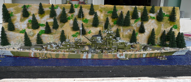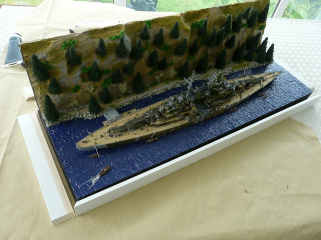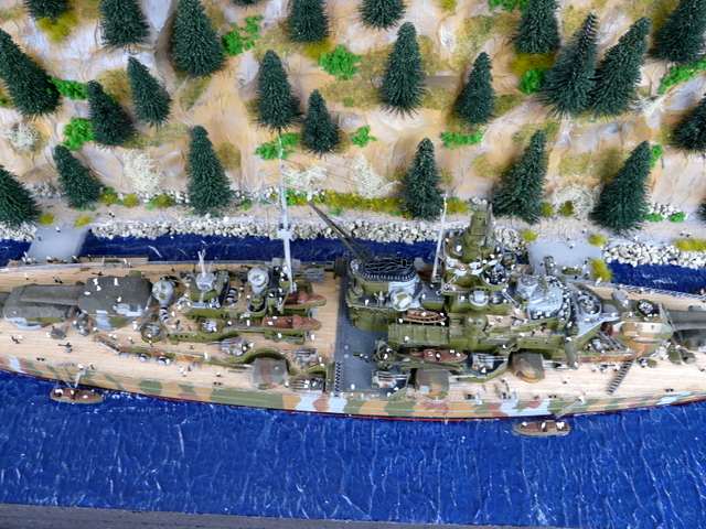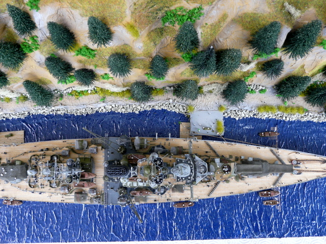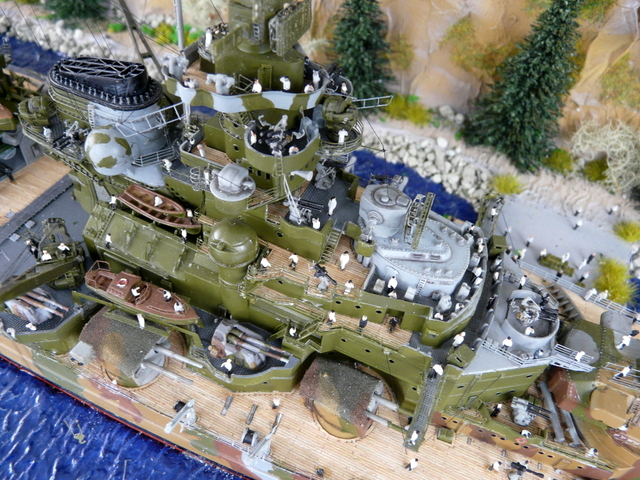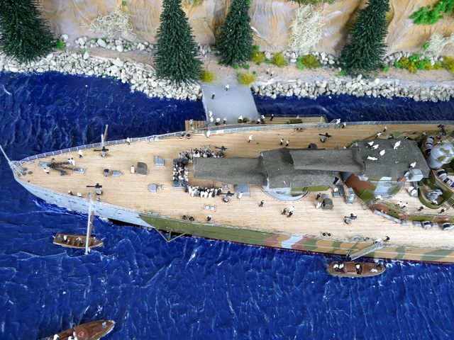 Quant au diorama, par lui même, j’ai présenté quelques photos à des amis, l’un deux, mon homonyme Prez du Relecq m’a dit : « ça manque d’arbres ». Me revoilà reparti en forêt, ma hache sur l’épaule tailler de nouveaux sapins. J’y ai mis tout ce qui me restait. Ensuite, il a fallu rajouter de la vie avec de nombreux marins. Et au bout d’un moment, il faut bien se dire : « c’est fini ! ». Un bon dépoussiérage et pose de la vitrine. Je suis assez content de mon boulot et j’étais déjà très heureux de le présenter aux copains dans les expos de la rentrée. Pas de bol, il n’y a plus d’expo. Beaucoup de plaisir à faire ce diorama qui sort tout de même des standards et gros avantages, pas de drapeau Allemand, ni de croix gammée, camouflage oblige.