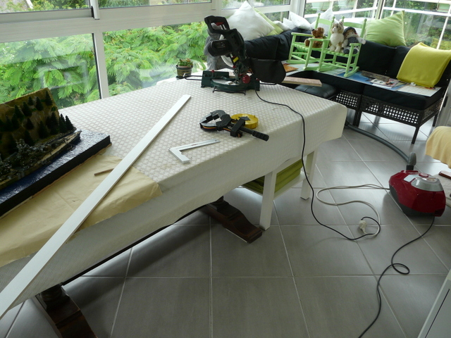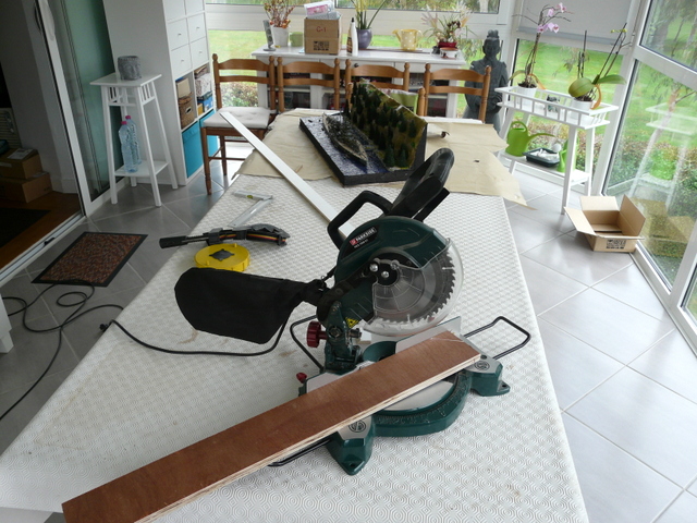 Découpe ensuite de l’encadrement. Le moment préféré de l’amour de ma vie avec la scie à onglet électrique sur la table, ( encore la LIDL) sympa avec sa visée laser. Notez sur la photo, l’aspirateur déjà en position de défense. Pour cela, j’ai peint au rouleau des tasseaux de pin, ( pas chers) et calculé la bonne longueur pour les 4 découpes. Pas facile de ne pas en rater. A noter que si c’est un millipoil trop court, vous pouvez toujours mastiquer et repeindre en blanc. Puis collage des baguettes PVC blanches de 10 mm, toujours avec la colle PRITT…..Elle sert à tout…….