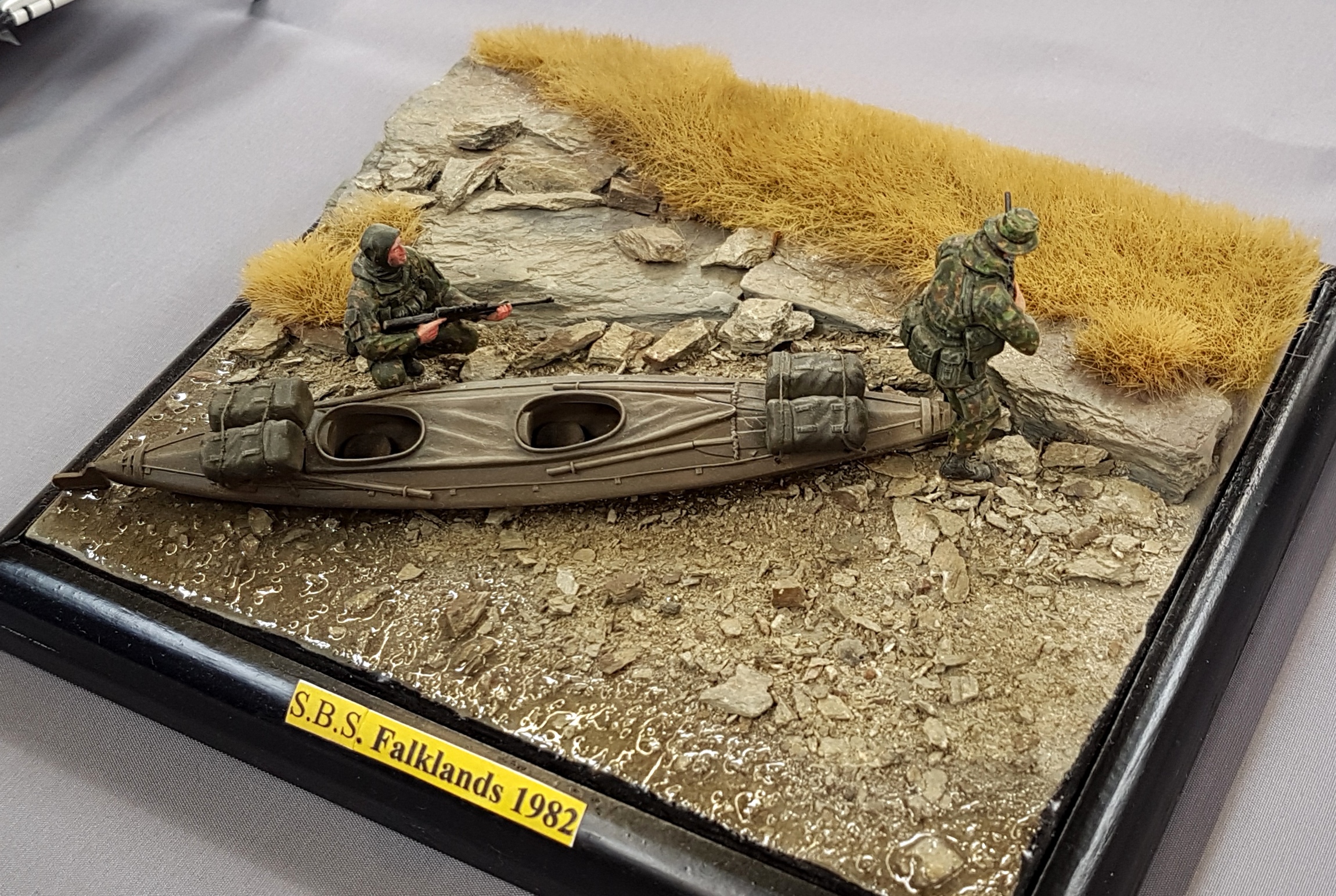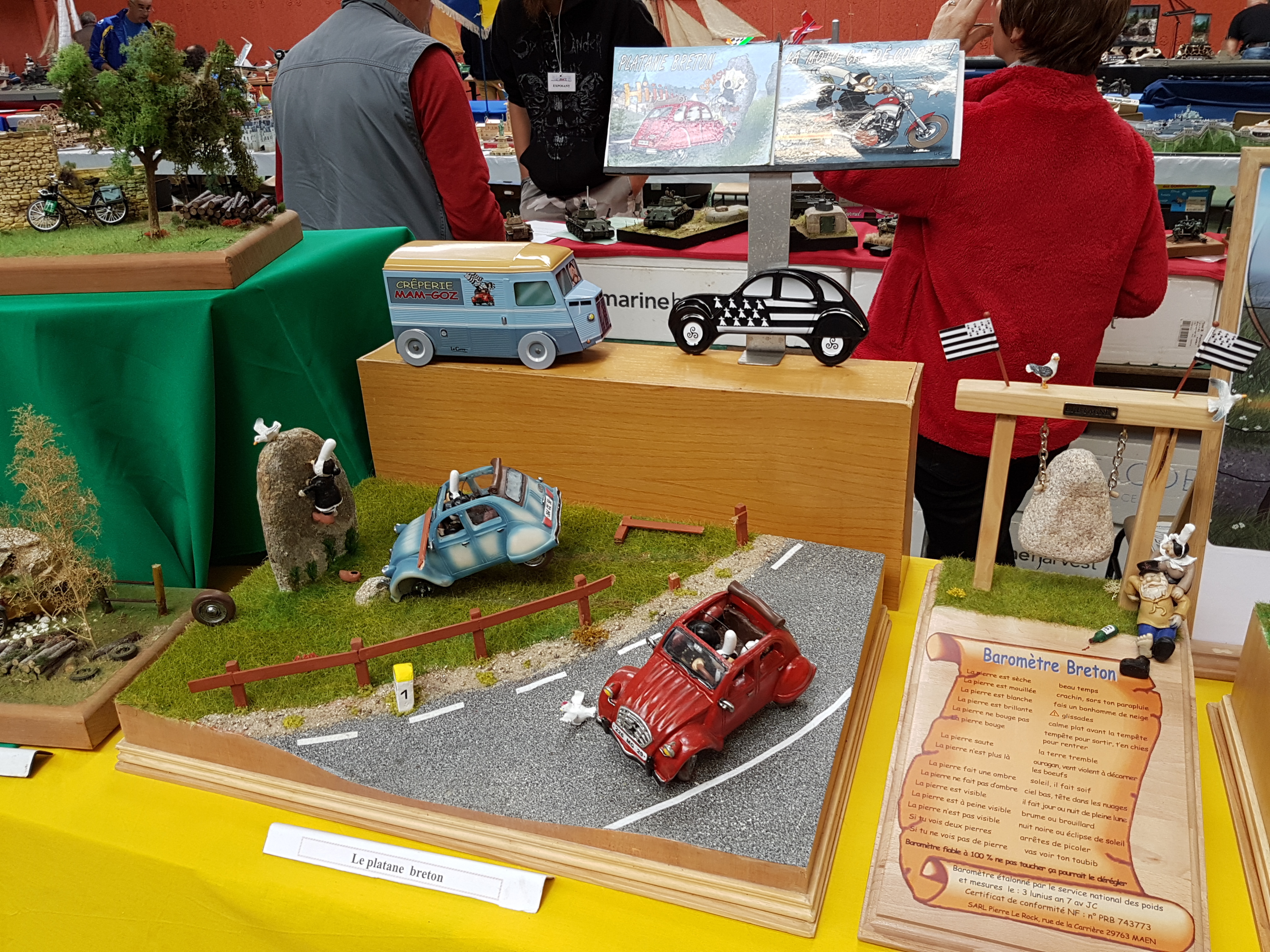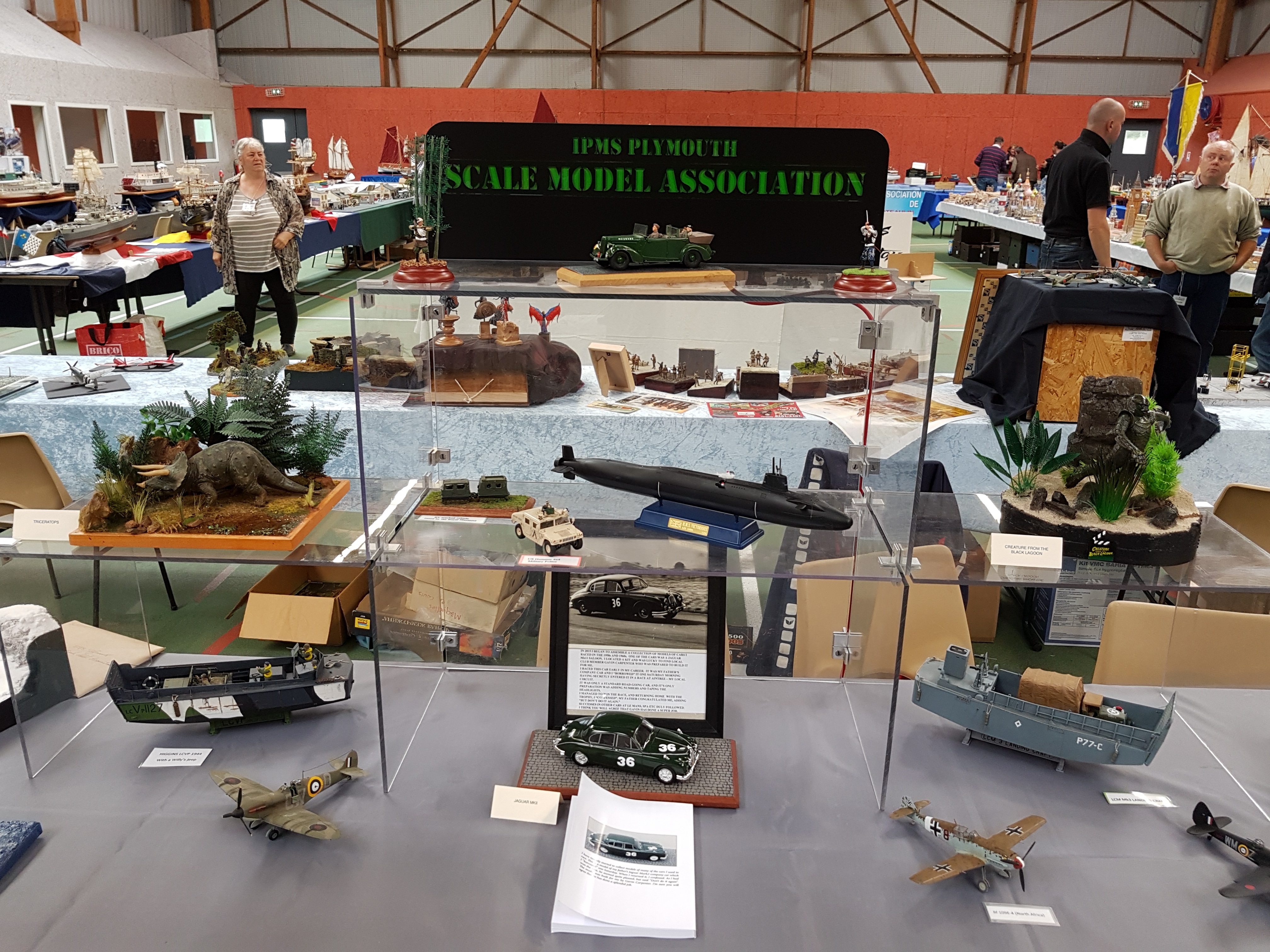 Nos amis de l’AMCL retrouvait leur salle après un salon 2015 à PLOUIDER pour cause de travaux dans la précédentes. Salle très bien garnie avec pour ainsi dire tous les styles maquettistes, ( avions, blindés, figurines, bateaux, trains, RC, etc….). Comme nous avons à chaque salon, des adeptes de la démo au stand, nos amis de l’AMCL avaient mis à notre disposition une table supplémentaire. Impeccable, donc ! Pour l’instant, pas de démo mais le repas du samedi midi préparé par Pierrot. Satisfaction générale. Le temps de débarrasser la table et nos campistes commencent leur démos : l’ami Thiébaud nous sort un blindé au 1/72 ème et attaque le montage comme un furieux, Yann sort l’ordinateur spécial et commence la mise en forme d’un minotaure qu’il moulera par la suite. Vraiment pointu tout ce bazar, Pierrot ne fait rien du tout, simplement « blablater ». Nos deux marins, ( Claude et Alain) préparent leurs bateaux et direction le bassin. Un peu trop petit le bassin, pour le porte avions à Claude, donc, il fait naviguer la vedette SNSM. Un peu de vent au bassin qui contrarie un peu certains pilotes, pas l’ami Alain qui est habitué à naviguer par tous les temps