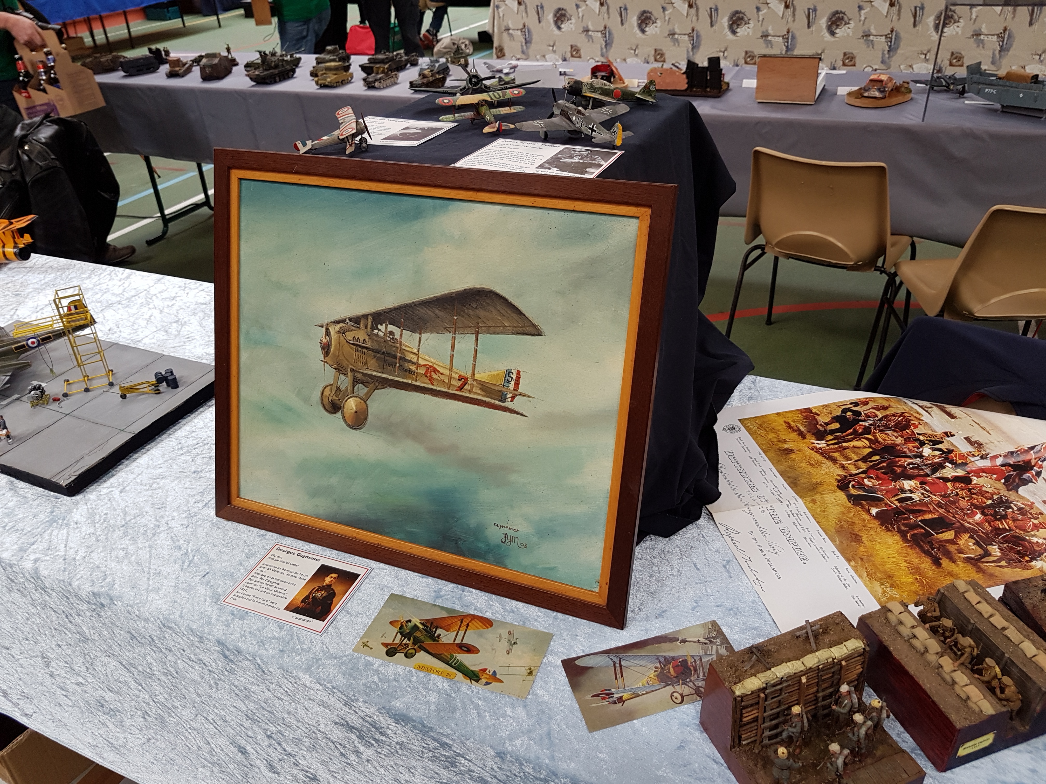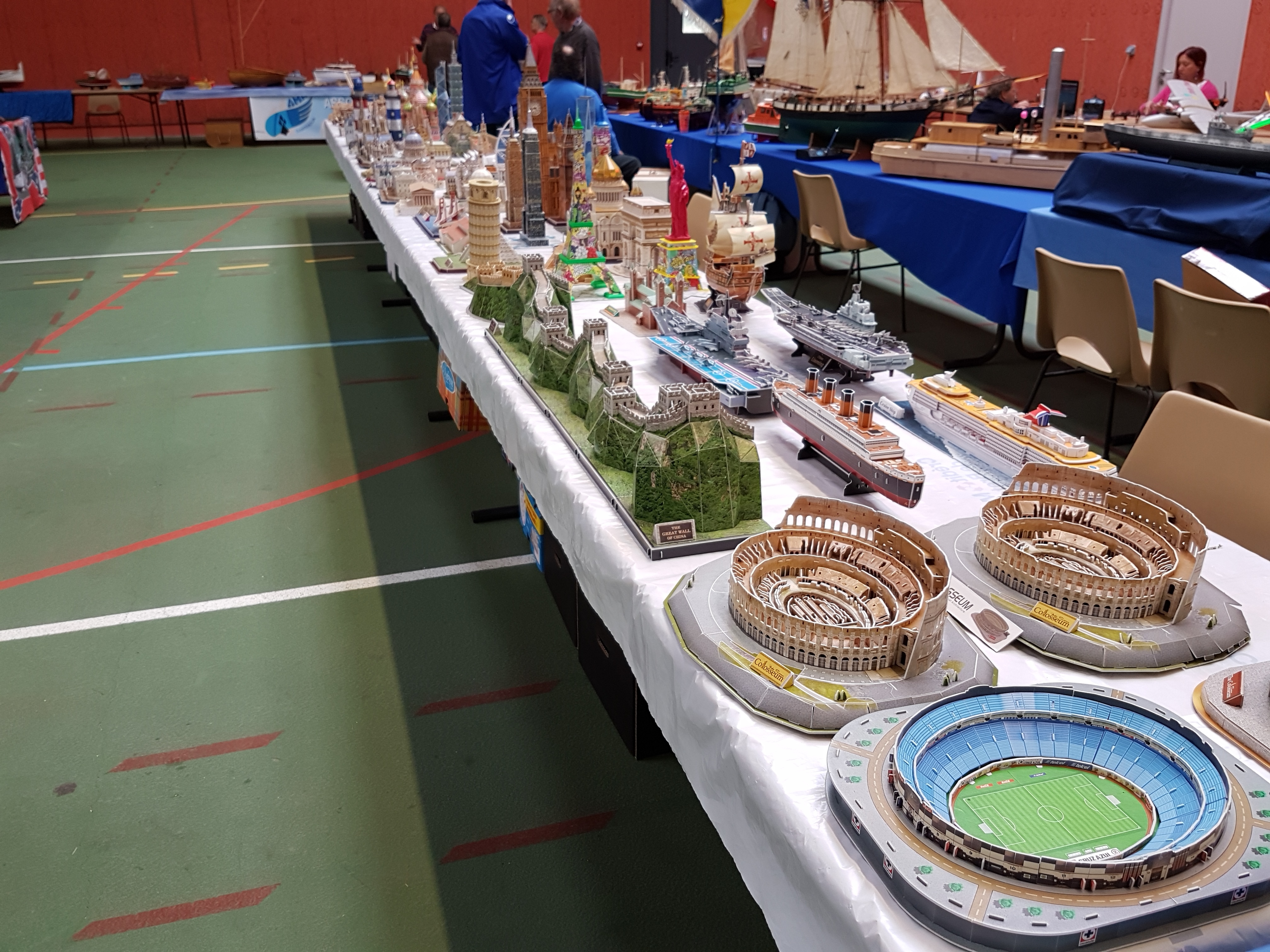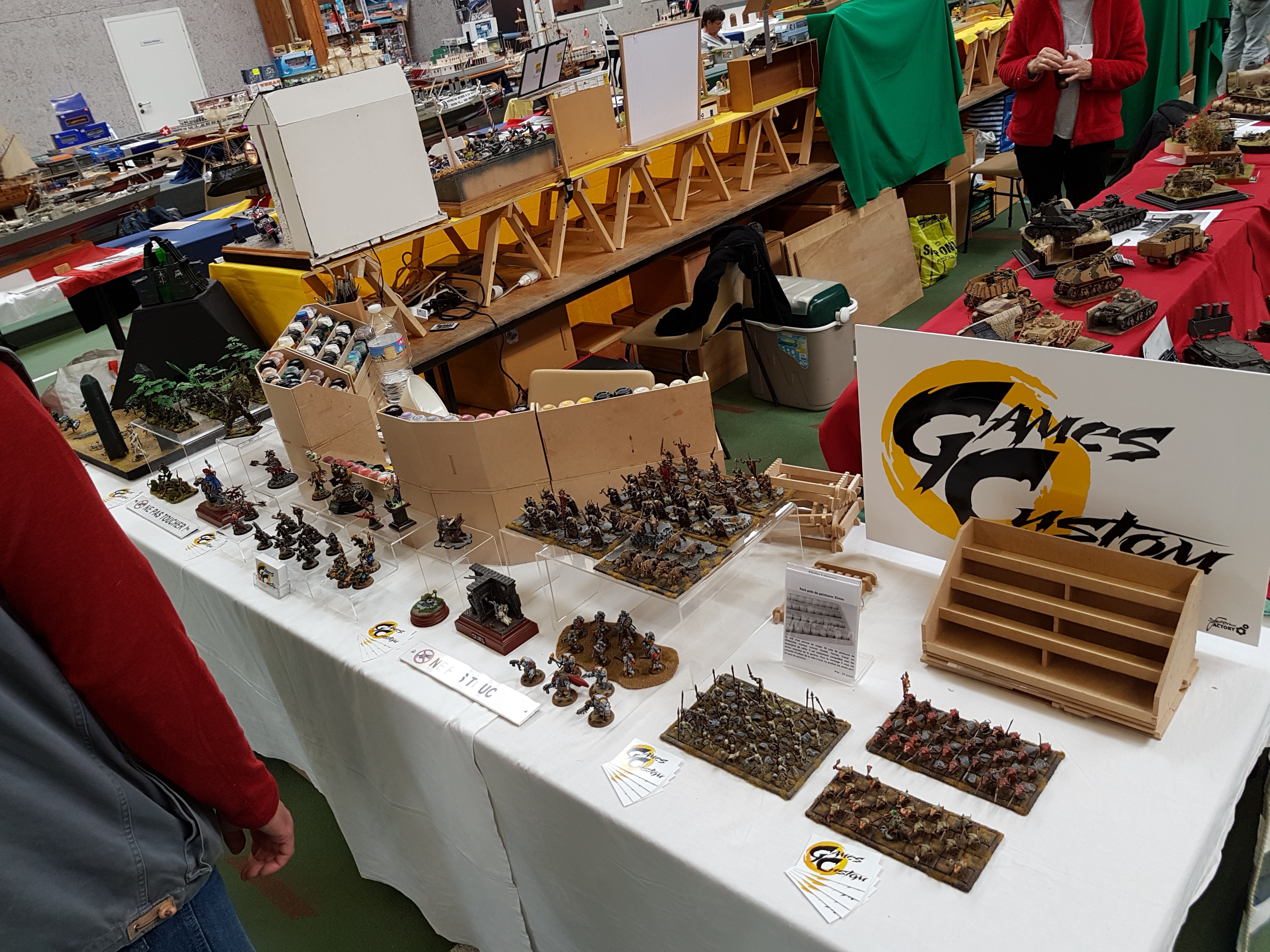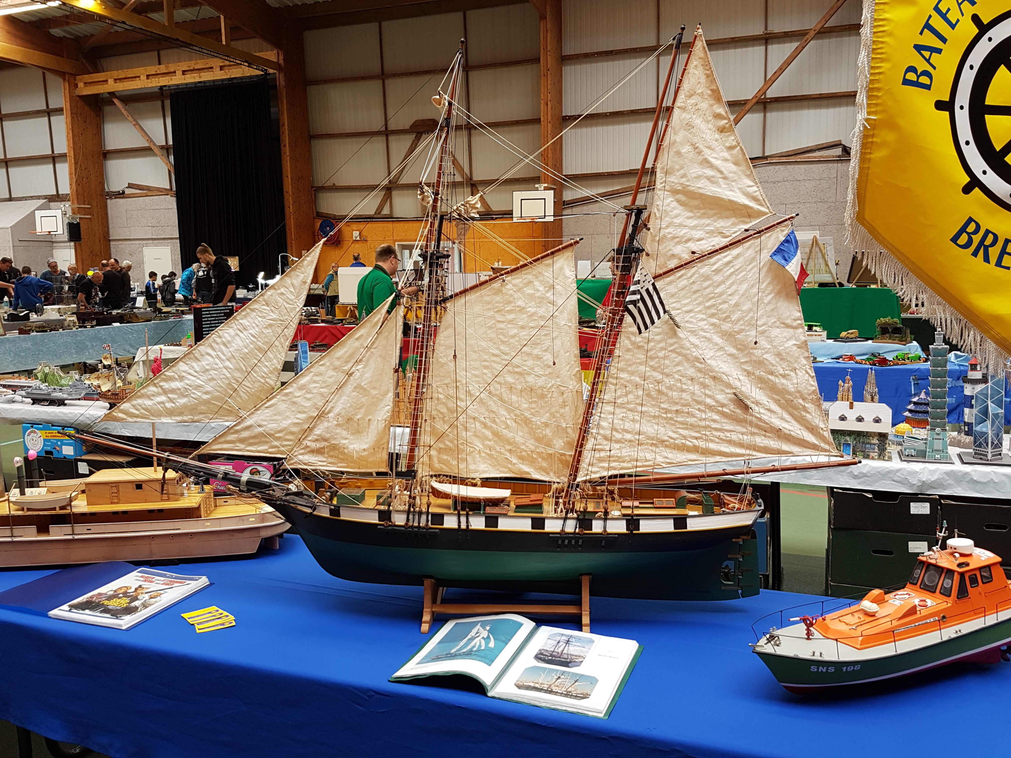 Réservation donc de 10 mètres de stand. Le samedi matin, rendez vous des campistes à 10 h. Salut à toute l’équipe organisatrice, repérage du stand et on installe. Notre ami Claude, toujours fidèle pose ses deux bateaux RC, (un porte avions américains au 200 ème et une vedette SNSM), Alain, (C), sa splendide chaloupe vapeur qui commence à se faire une réputation sur le circuit. Voilà pour le RC. L’ami Pierrot présente un peu de bateaux statiques, (marine Française surtout), le coin bateau opérationnel ! L’ami Yann déballe la vitrine et y met ses figurines fantastiques. Une étagère vite construite avec des caisses à bateaux par les mains expertes de l’ami Franck et Pierrot peut y positionner ses deux caisses de figurines, ( toutes époque et toutes échelles). Stand CAMPI enfin prêt ! Dégustation du café- pain au chocolat offert par nos amis organisateurs. Petit tour de salle pour y saluer tous nos amis présents et inauguration du salon vers 11 h 30. Petit discours de l’ami Neil, Président de l’AMCL, quelques mots d’un représentant de la municipalité et TREFLEZ expo 2017 est lancée.