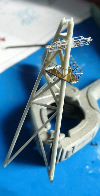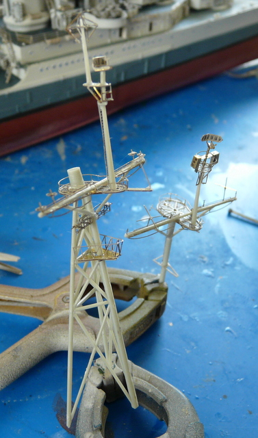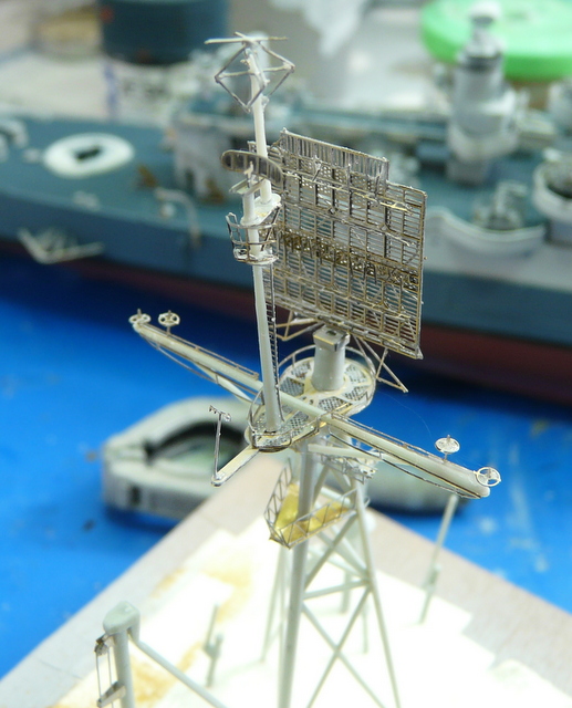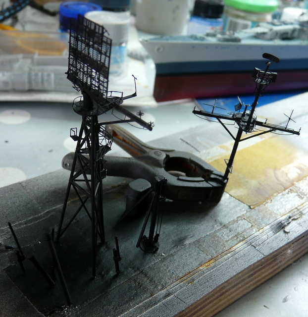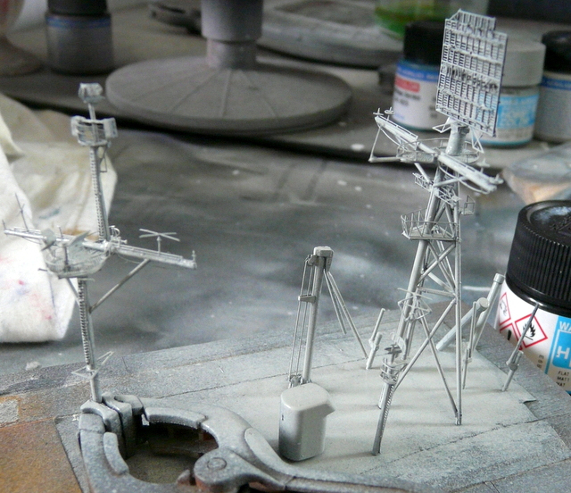 En parlant d’orfèvrerie, j’attaque le montage des deux mats. Et béééééé ! Ce n’est pas de la tarte. Avec la photodec, ça rame. Déjà pour faire prendre une petite pièce à la cyano, la faire sauter avec le moindre pet d’une mouche de passage et la chercher à quatre pattes au sol pendant une heure. Il faut beaucoup de patience. Il y a un grand radar plat tout à refaire en photodec. Il est vrai que cela remplace avantageusement celui fourni par ACADEMY qui est un rectangle de plastique noir, à la manière des bonbons ZAN à la réglisse de notre enfance. Une fois de plus, le plan EDUARD ne nous renseigne pas vraiment. Les flèches sont bien là, mais où vont-elles réellement ? On aurait aimé, je me répète, une vue d’ensemble, des croquis du montage fini , une photo de l’ensemble monté. La doc sur internet ne nous sert pas plus, pas vraiment de gros plans sur ce radar. J’ai attendu pour le faire et j’ai fini par le monter à la ALPERS. Apprêtage en noir mat puis peinture en gris.