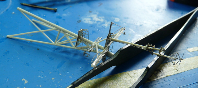 La pose des mâts : le petit mat avant, pas très difficile. Le grand mat, ce n’est pas une sinécure. Trois micro tétons à glisser dans leur trou respectif. Le tout plein de colle, il faut bien viser. Malgré cela, ça ne va pas en place et on ripe en étalant la colle sur le pont. A chaque emboîtage parfait, le mat saute de ses logements. J’ai rusé en bridant le tout avec un système maison. On ne touche plus, on verra bien demain.