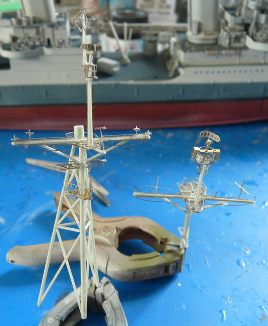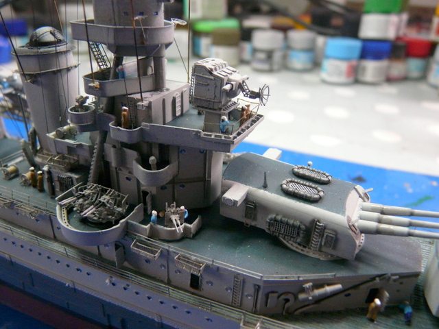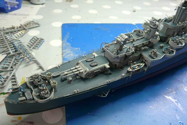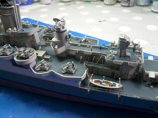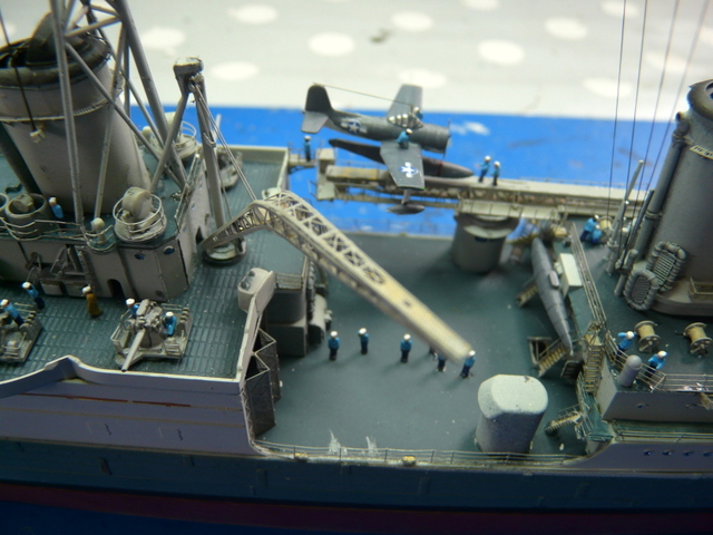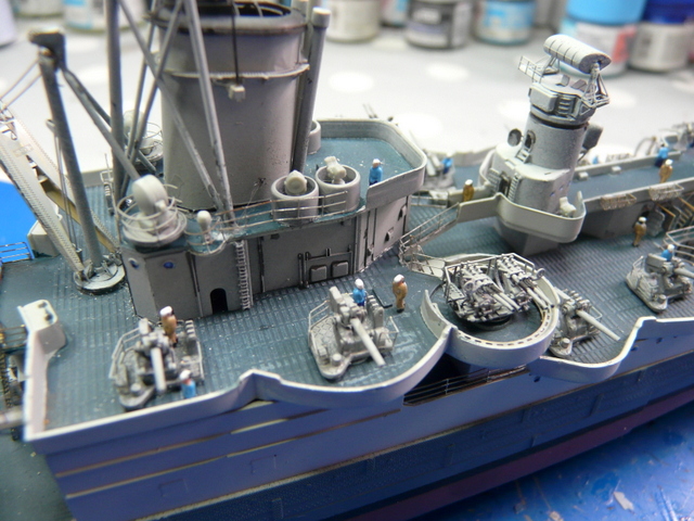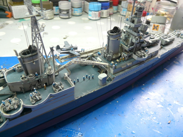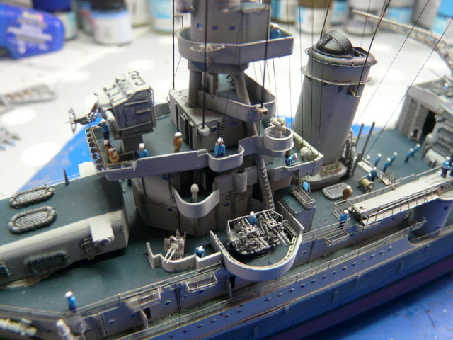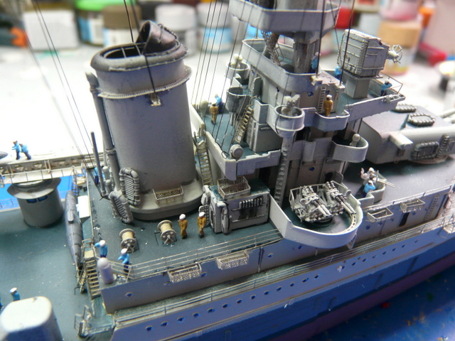 Reprise du chantier après une longue pause estivale (quoique, il n’a pas fait tellement beau, chez nous !). Comme, je le dis toujours » le plus dur, c’est de terminer un modèle ». Il faudra « haubanner » la mature. ACADEMY ne précise rien sur le sujet. Recherches sur internet, visionnage de plusieurs montages, un mixte de tout, faire au plus réaliste. J’utilise le fil lycra noir INFINI MODEL, 70 deniers, c’est un matériau super, qui se colle facilement avec des points de cyano, (quand cela veut bien prendre !). Armement du navire en équipage, toujours avec mes figurines FUJIMI au 350, (ça date un peu, mais ça le fait !). Les marins en tenue de service : pantalon bleu marine et chemise bleu claire, le gratin ( entendez par là, les gradés ! ce n’est pas un plat de patates), en kaki.