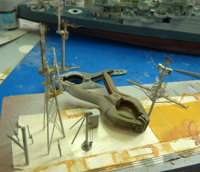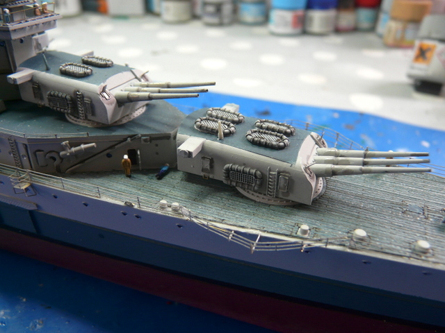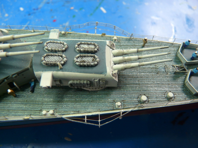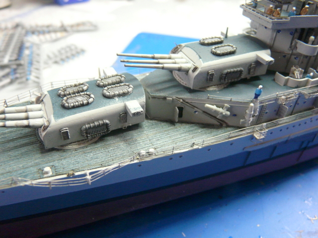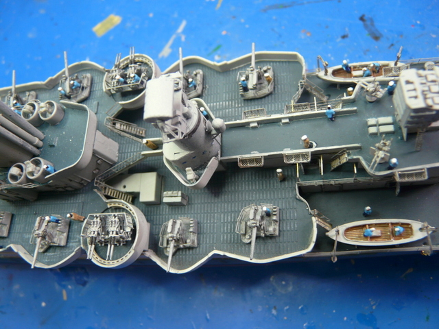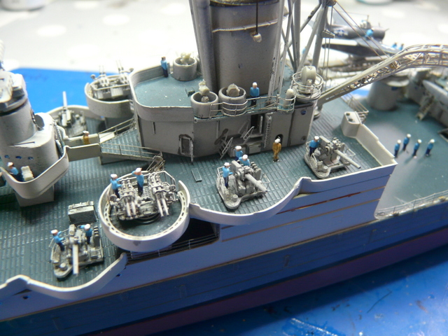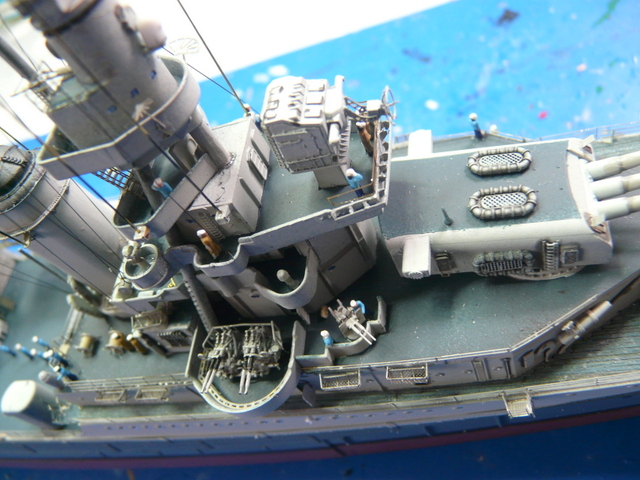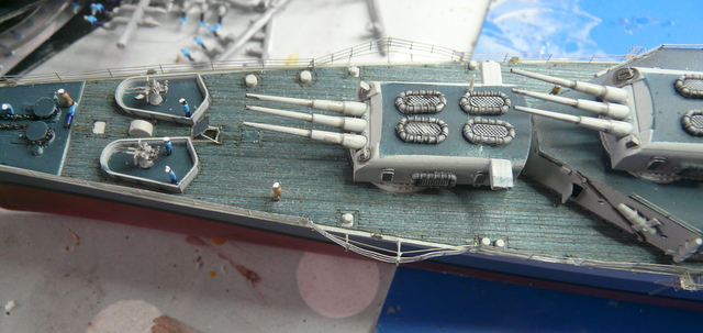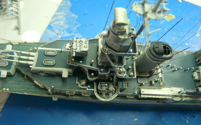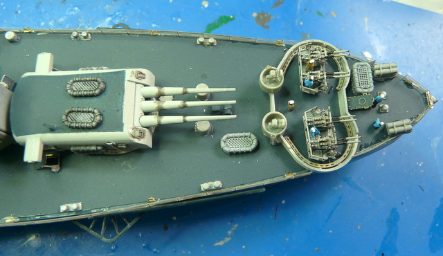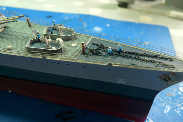 Je me suis arraché les cheveux ( c’est juste une expression, j’y tiens à mes cheveux), avec la rambarde sur le pont avant. C’est la première fois que je vois cela et, en fin de compte, c’est très logique. Au niveau de la premère tourelle, le débattement du canon passe au dessus de l’eau. Pour pallier à cela, la rambarde fait un bon décoché au-dessus de l’eau. EDUARD fournit ces pièces mais au niveau plan et explications, c’est plus que très sommaire : je n’ai rien compris ! (qui a dit : « commence à taper dans les gamelles, le vieux ! »). En fin de compte, j’ai bousillé les pièces EDUARD après maintes tentatives de positionnement et de collage. Je me suis rabattu vers le « made in maison ». J’ai taillé les supports dans du fil laiton extra fin et utilisé de la rambarde normale. Un après-midi de lutte acharnée pour cela, le résultat est potable et se noie, en fin de compte, dans la vision d’ensemble du modèle.