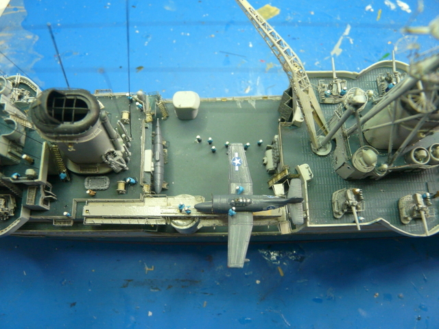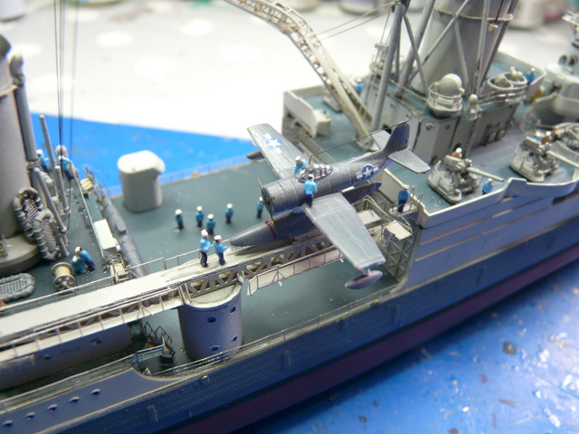 Plus on avance dans les finitions, plus c’est dur : un coup de doigt malheureux et les pièces de photodec sautent. L’avion n’est pas très fin, mais il fera l’affaire. Beaucoup de difficultés pour le poser sur son berceau sur la catapulte. Il ne veut pas tenir ! De plus, les fameux coups de doigts malheureux ou maladroits, le feront chuter deux ou trois fois à fond de cale, (scrongneugneu de scrongneugneu !). La pause des fils ne pose pas trop de problème. Il y a les jours « avec » et les jours « sans » où il vaut mieux ne pas insister et aller se taper un bon film dans son canapé (tiens ! je viens de revoir « les briseurs de barrage », superbe avec tous les Lancasters d’époque).